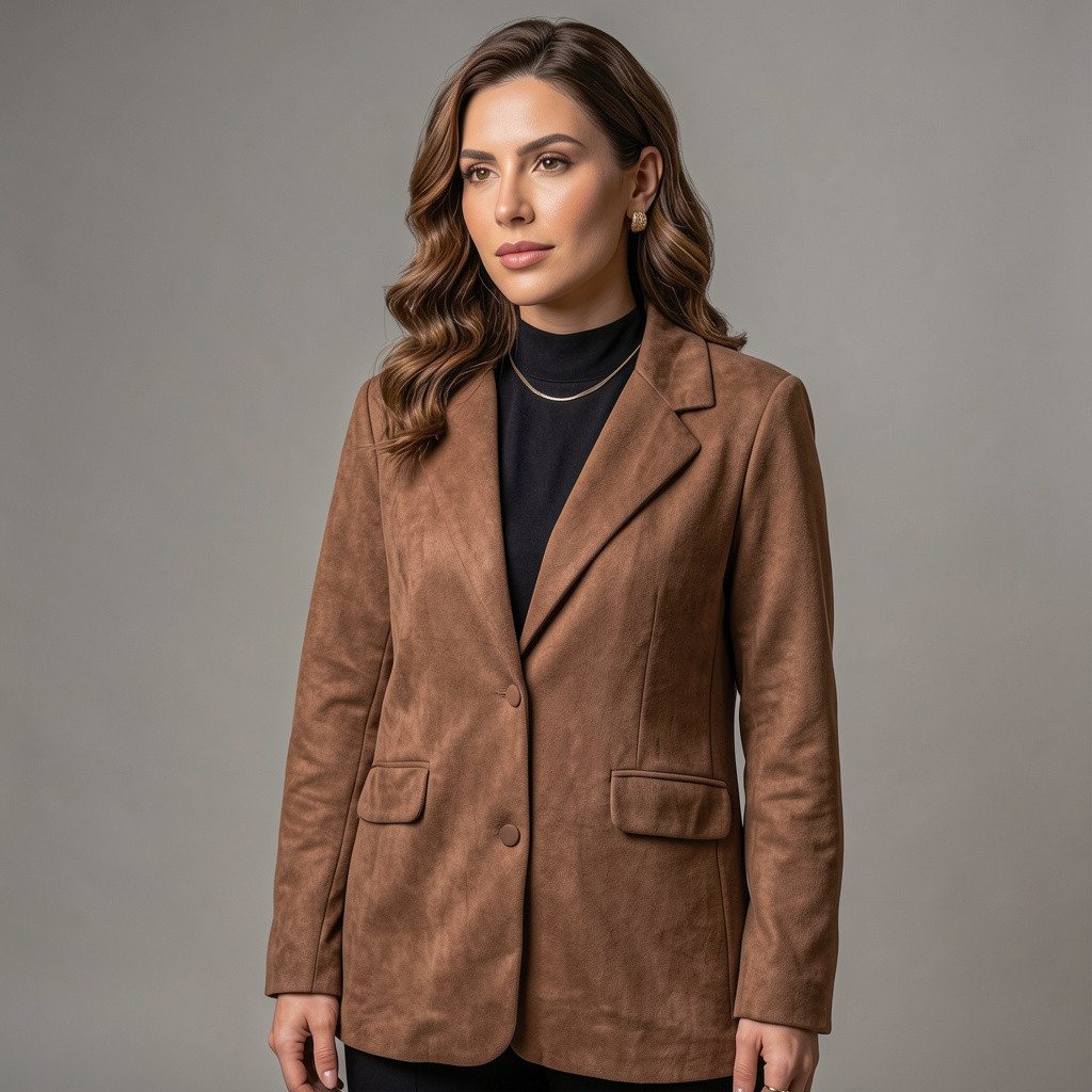O modelo apresenta lapela clássica, fechamento frontal por botões e bolsos frontais com aba, detalhes que reforçam o estilo elegante da peça. A textura macia do suede adiciona profundidade e modernidade ao visual.