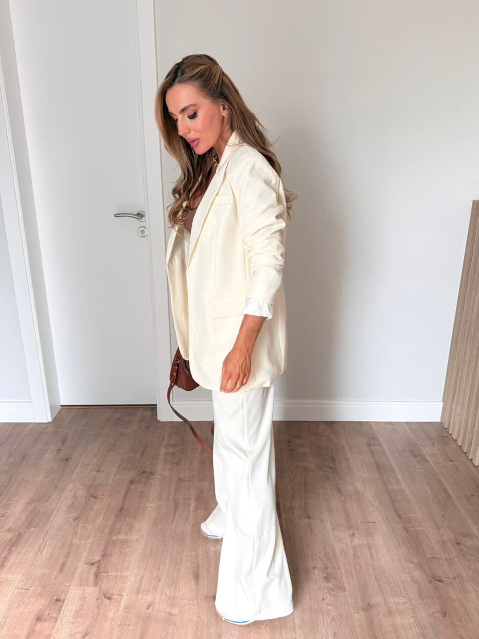 O blazer apresenta lapela clássica, fechamento frontal por botão e bolsos com aba, detalhes que reforçam o acabamento elegante da peça. A calça de alfaiataria complementa o conjunto com caimento impecável e modelagem que alonga a silhueta.