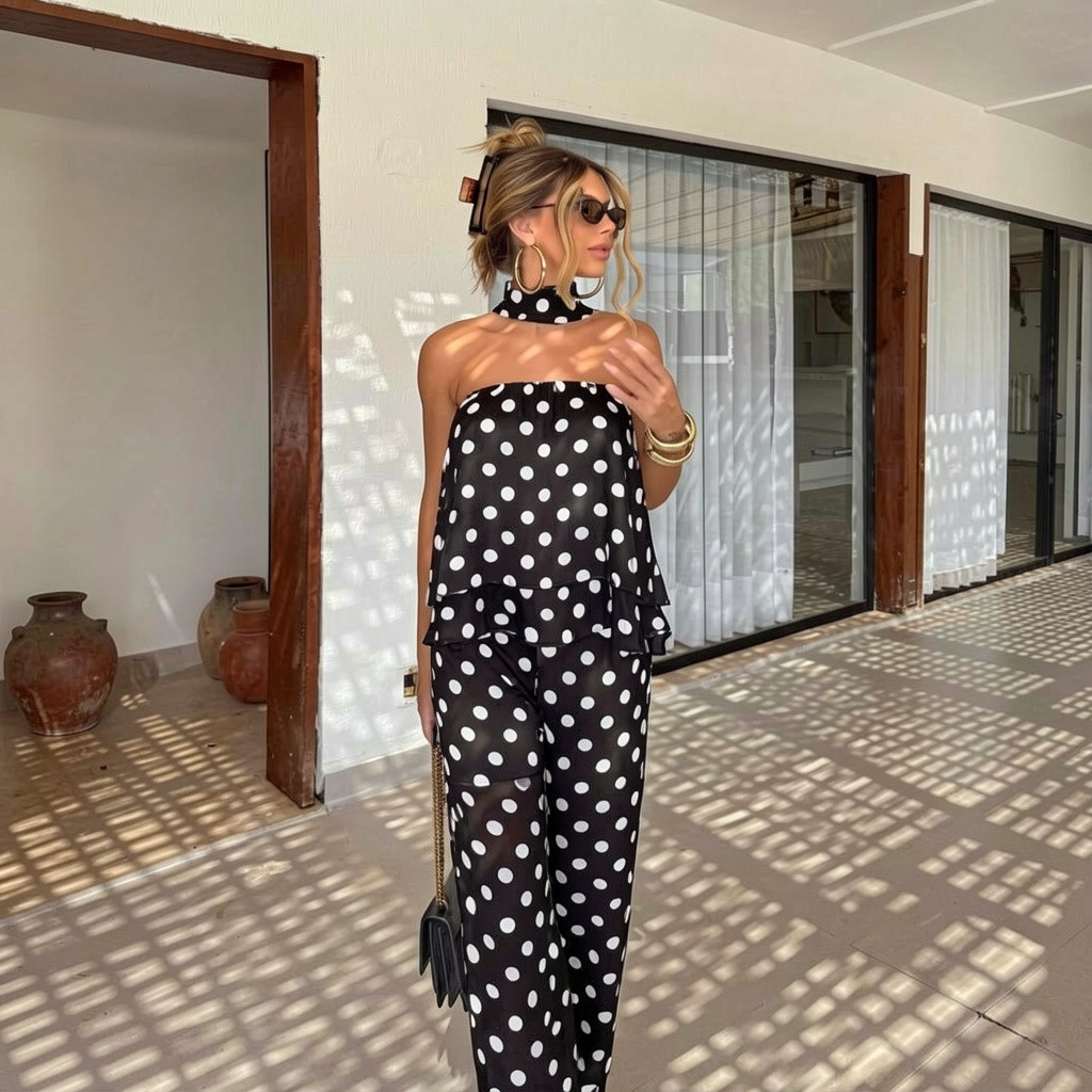 A blusa apresenta babados que valorizam a silhueta e criam um efeito delicado e feminino, enquanto a calça de modelagem reta alonga a silhueta e garante conforto ao vestir. A estampa de poás em contraste adiciona um toque atemporal ao visual.