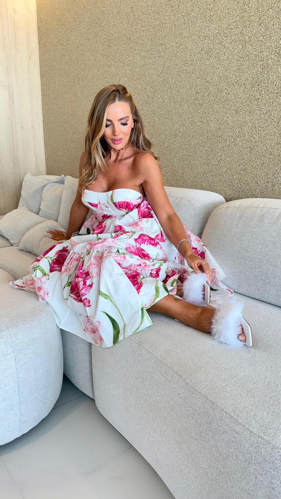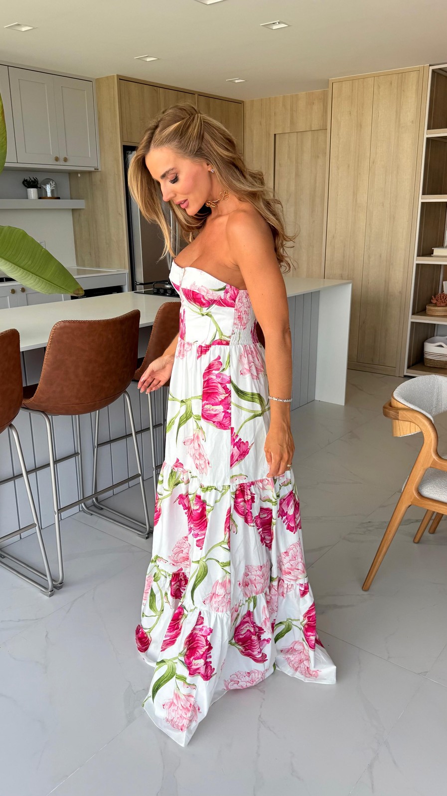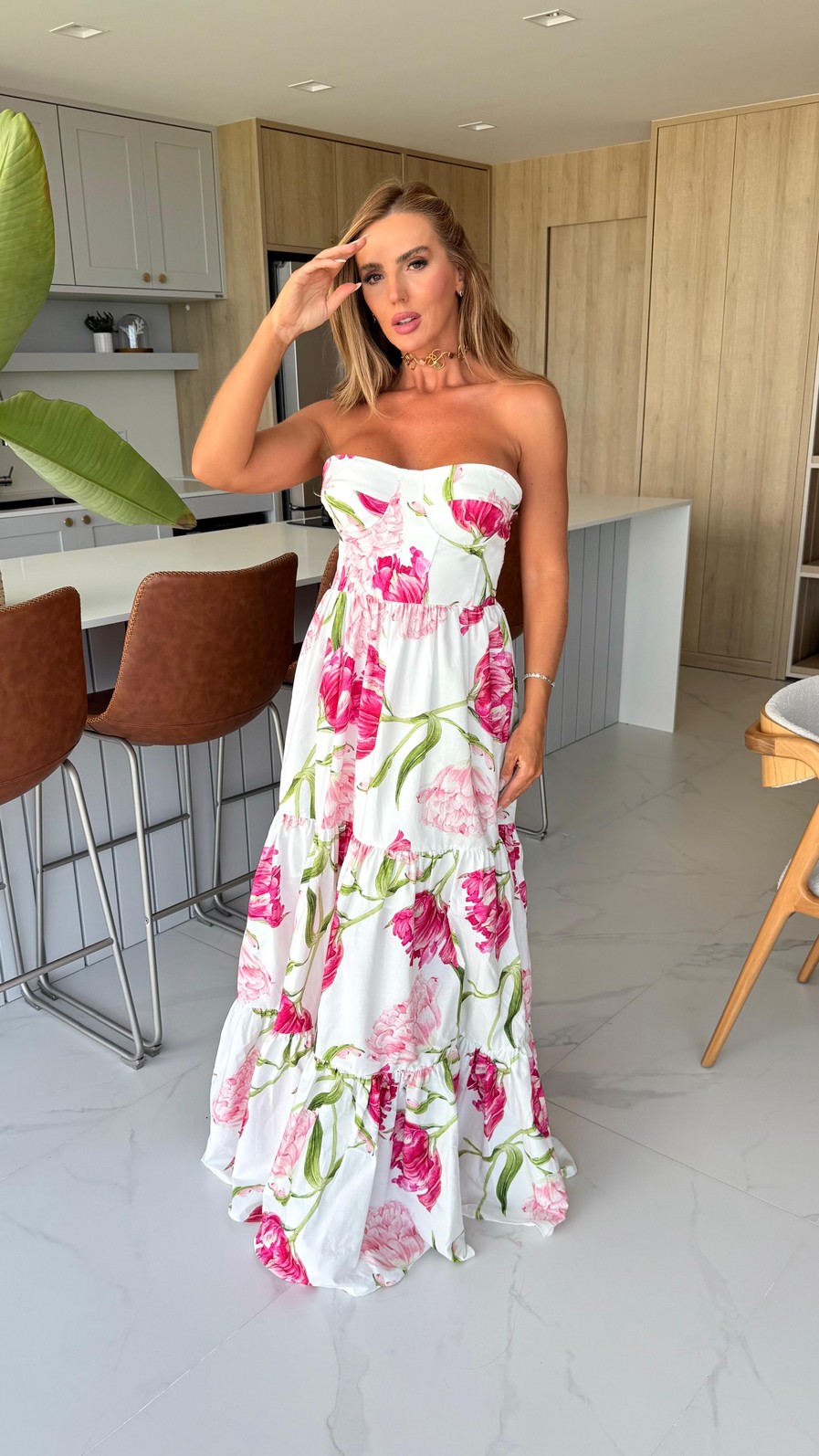 O modelo tomara que caia valoriza o colo, enquanto o busto estruturado garante sustentação e um caimento impecável. A cintura marcada alonga a silhueta e a saia em camadas traz movimento e fluidez, criando um visual delicado e cheio de charme.